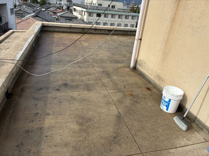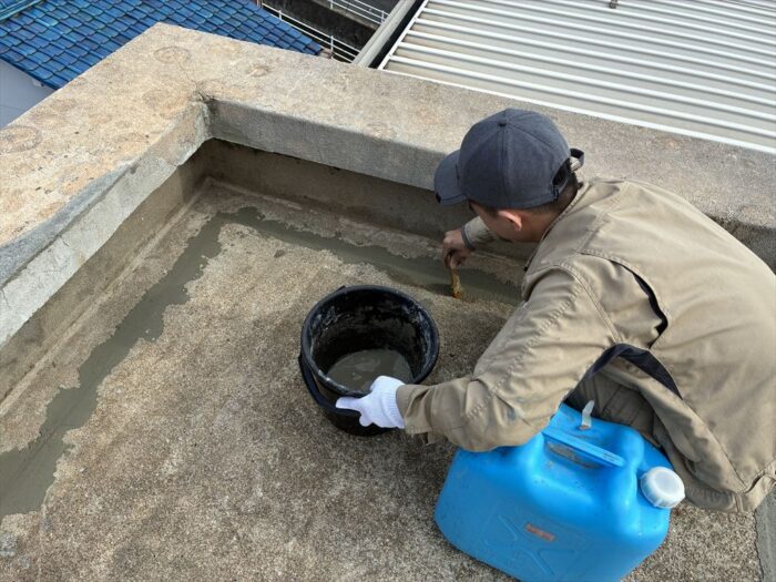 本日は自社物件のリノベール王子で屋上防水作業を行っております。