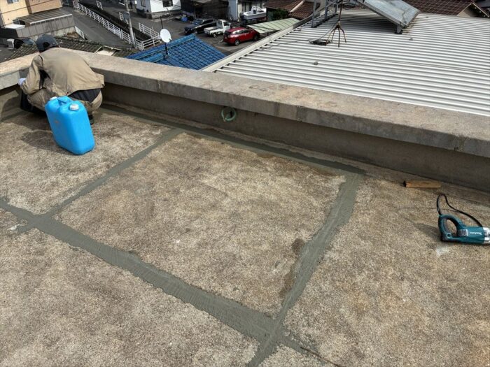 現在の工程は下地調整作業で、目地を潰しております。