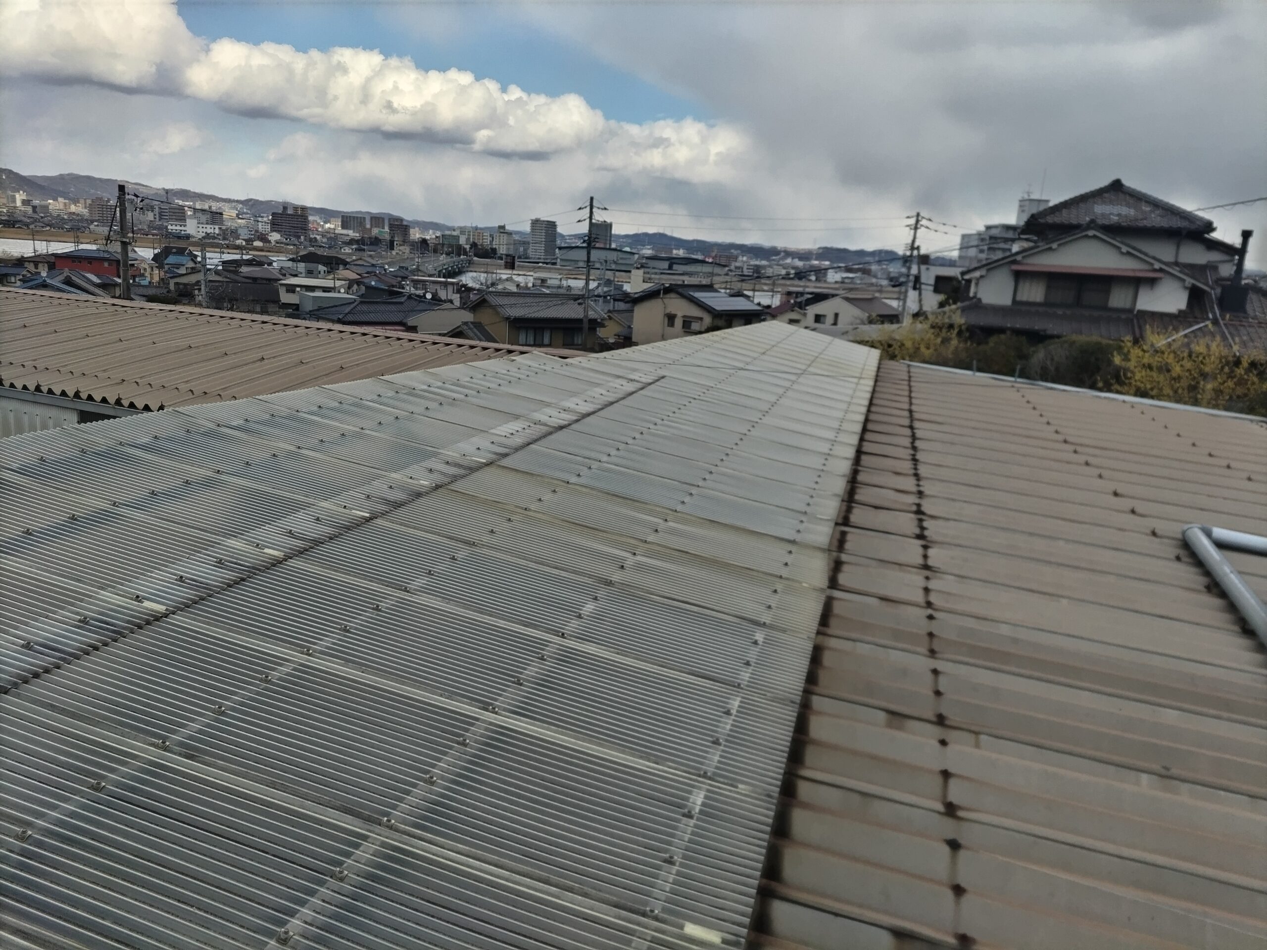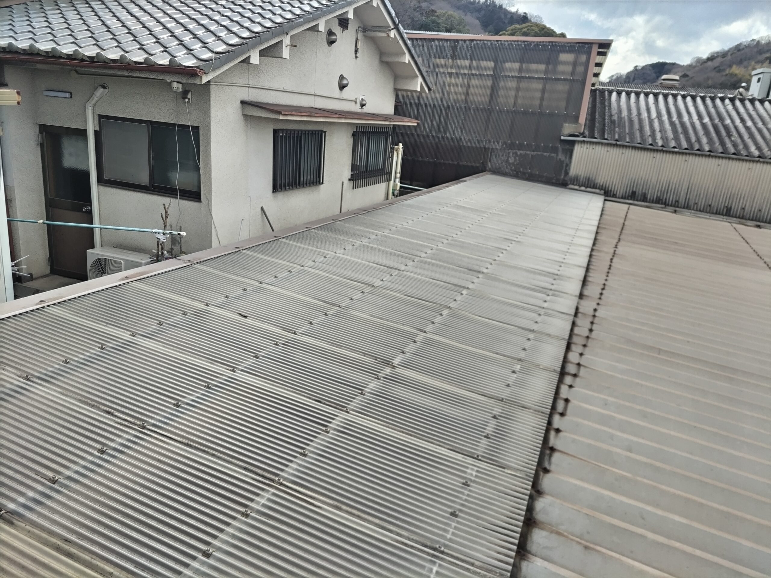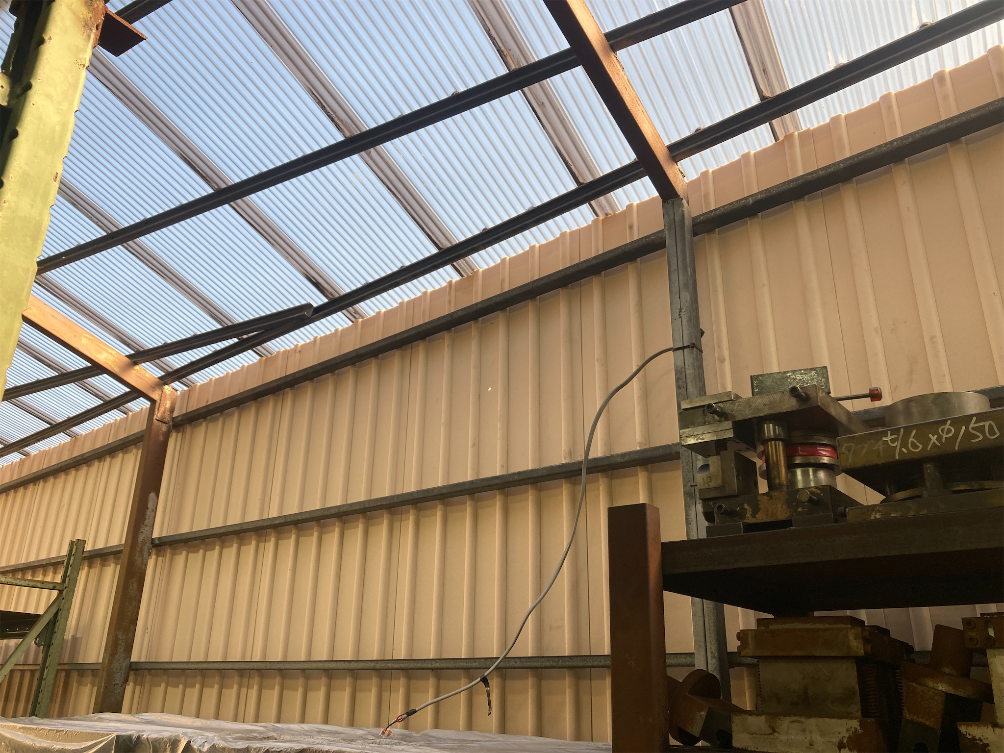 工場兼倉庫の夏の暑さ対策のため、既存のポリカーボネート屋根材を撤去し、ガルバリウム鋼板スレートへ葺き替えました。