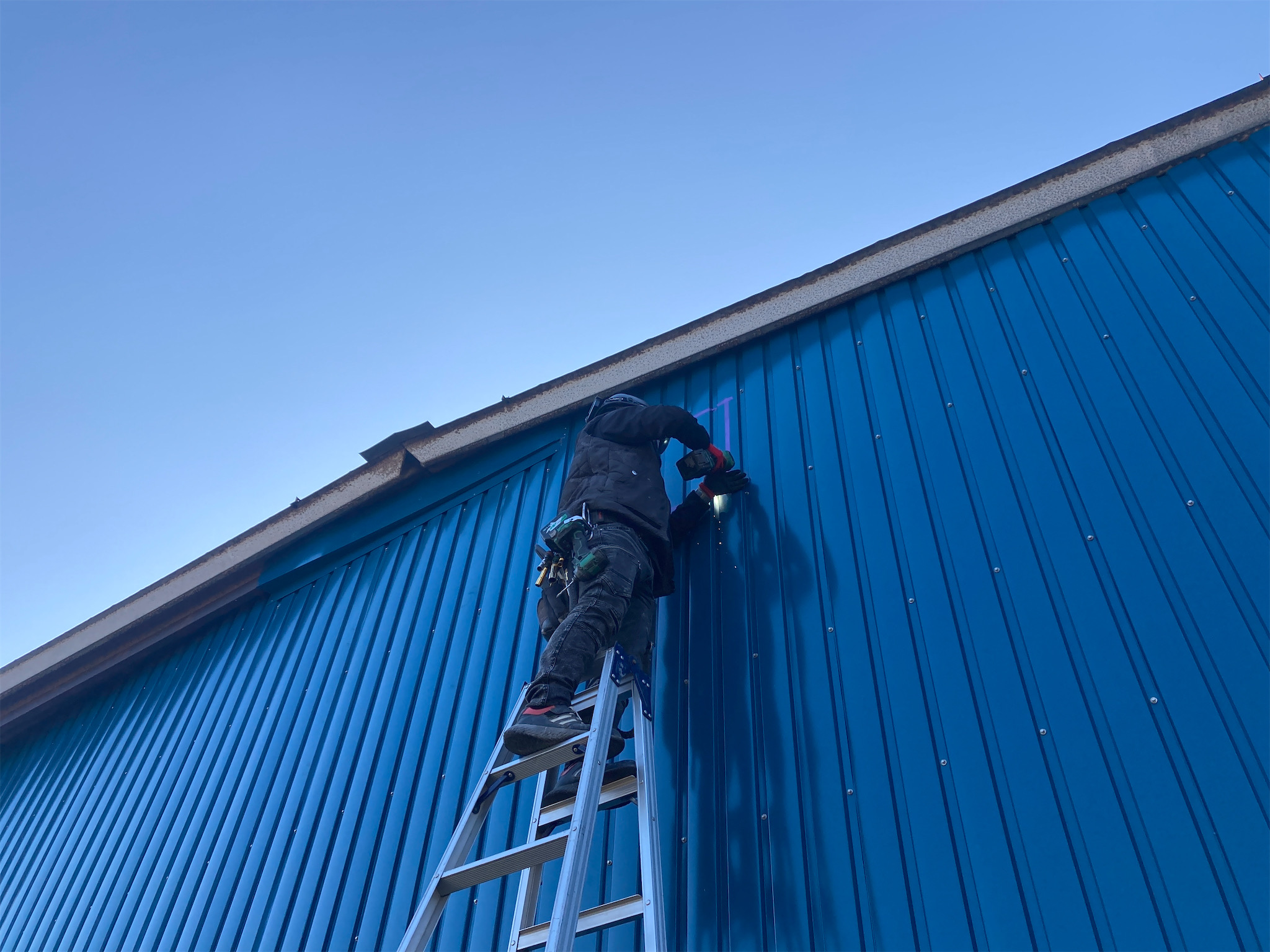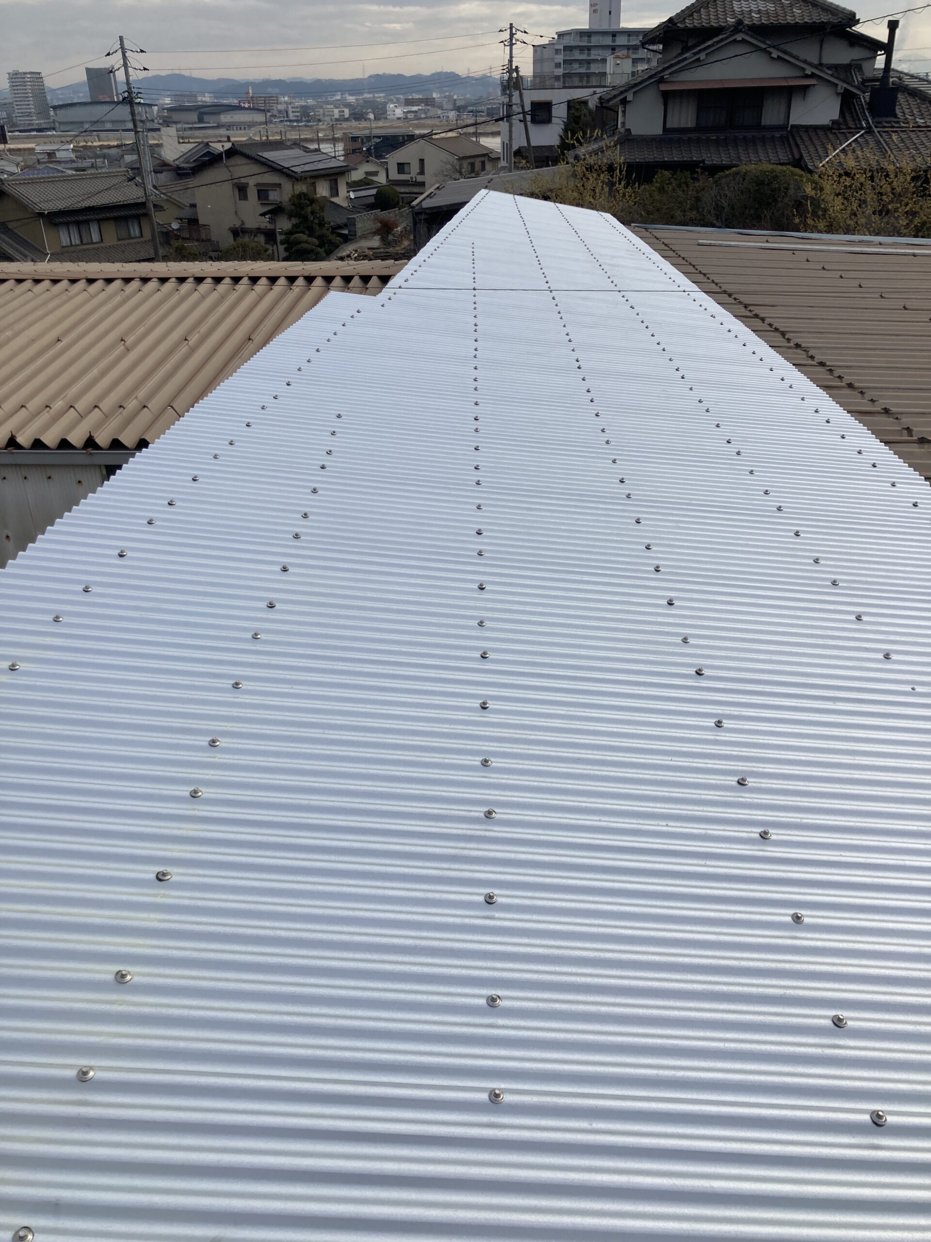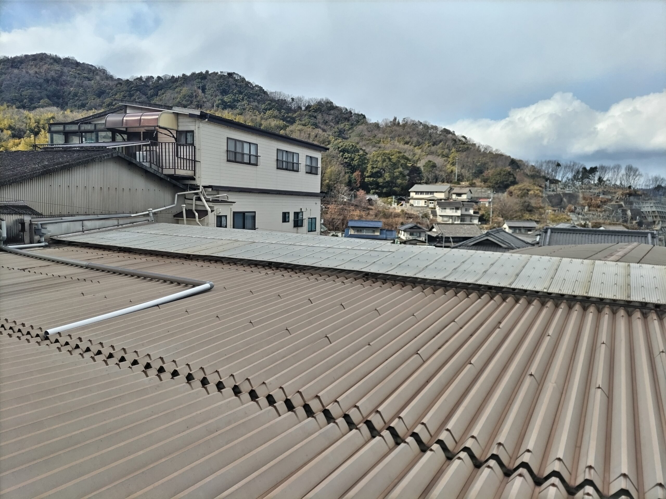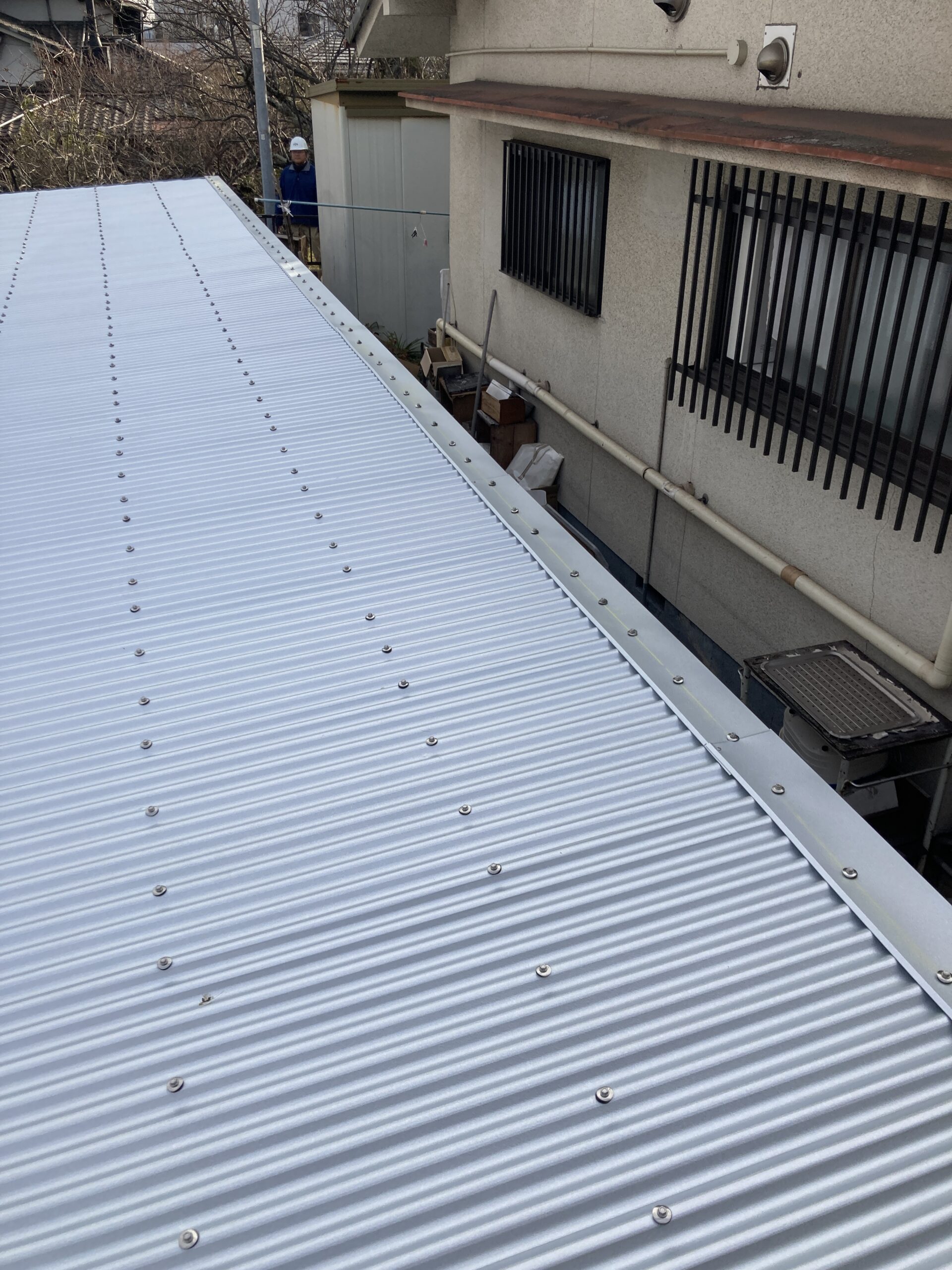 工場兼倉庫の夏の暑さ対策のため、既存のポリカーボネート屋根材を撤去し、ガルバリウム鋼板スレートへ葺き替えました。